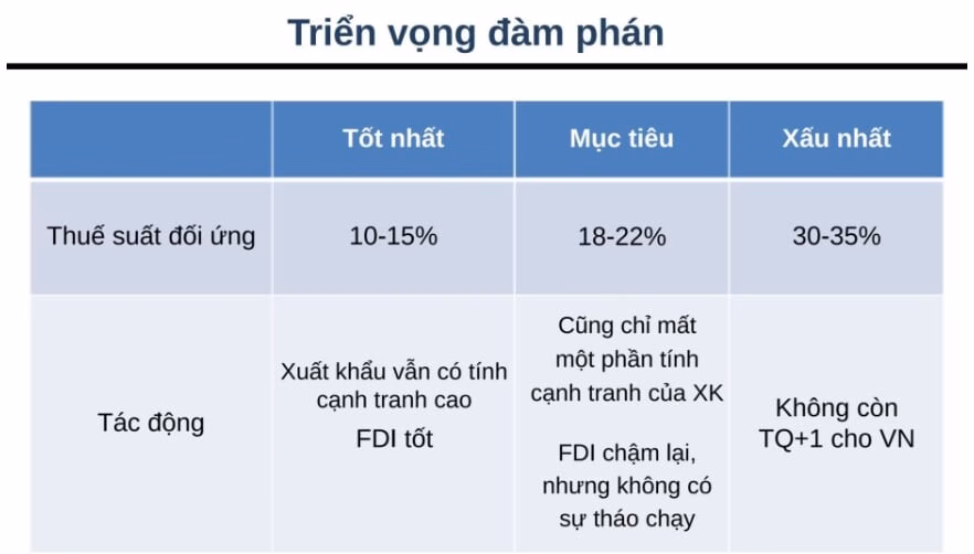 Trước mức thuế 20%, các doanh nghiệp xuất khẩu của Việt Nam đang tập trung vào việc điều chỉnh kế hoạch trong “vùng chịu đựng” của mức thuế này. Các ngành như dệt may, thủy sản, gỗ và các ngành khác đang phải đẩy nhanh tiến độ giao hàng, giảm giá thành sản phẩm và chuyển hướng sang các thị trường khác như EU, Nhật Bản và thị trường nội địa. Mục tiêu chính là giảm sự phụ thuộc vào thị trường Mỹ và đa dạng hóa các thị trường xuất khẩu.
