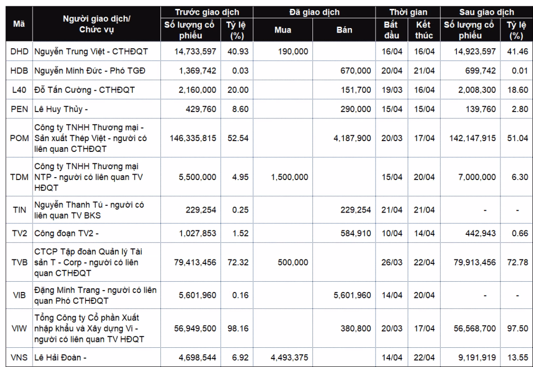 Một trong những điểm nóng đáng chú ý nhất là tại CTCP Thép Pomina. Công ty TNHH Thương mại và Sản xuất Thép Việt (do gia đình Chủ tịch Đỗ Duy Thái thành lập) đã thực hiện bán gần 4,2 triệu cổ phiếu POM trong giai đoạn từ 20/3 đến 17/4.