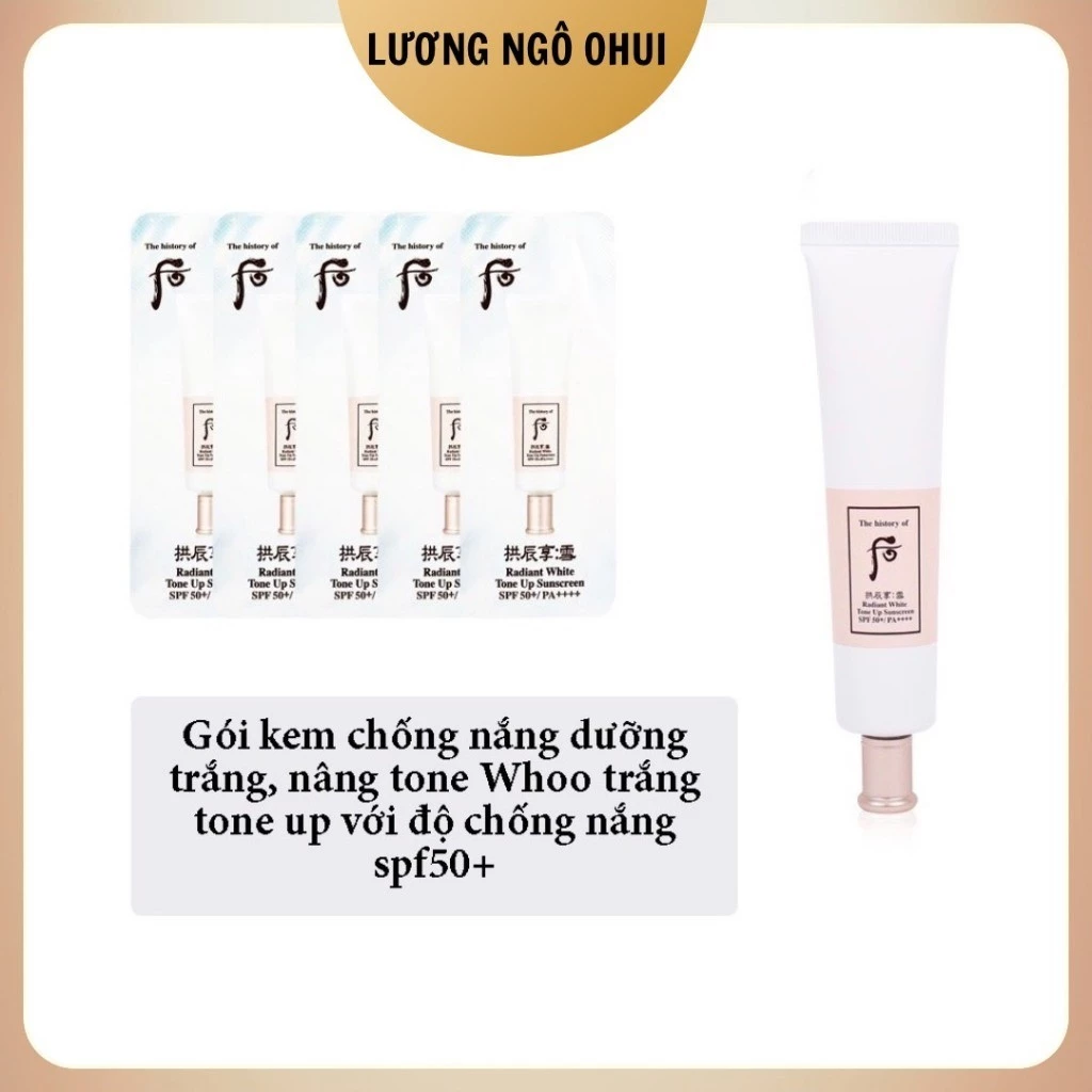 Combo Gói kem chống nắng dưỡng trắng nâng tone da trắng hồng Whoo Radiant White Tone Up Sunscreen chứa các thành phần như vitamin C, niacinamide và các loại tinh chất thiên nhiên giúp cải thiện màu da và làm sáng da. Sản phẩm này cũng có công thức không chứa dầu, giúp giảm thiểu khả năng gây nhờn bóng.