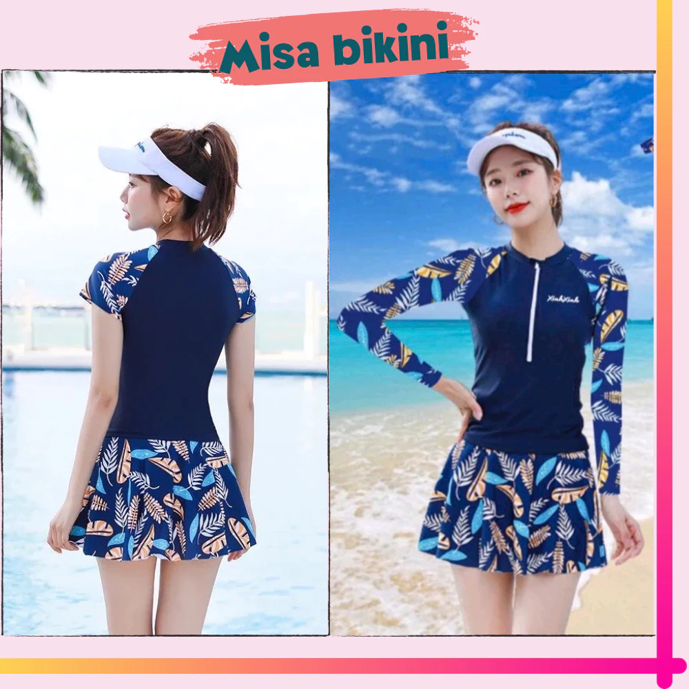 🔥 [ Size s -2xl ] Đồ bơi 2 mảnh nữ Misa bikini kín đáo đồ đi biển đẹp có tay phối váy xanh than họa tiết lá MS68 đang giảm giá!