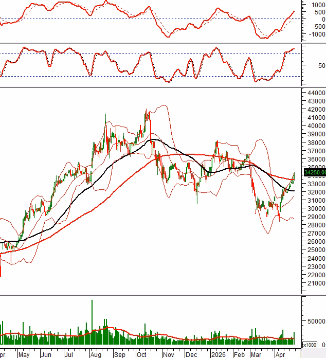 TCB đang cho thấy một xu hướng tăng giá rất bền vững. Việc xuất hiện mẫu hình nến Big White Candle (nến trắng dài) trong phiên 24/04, đi kèm với khối lượng giao dịch bùng nổ vượt xa mức trung bình 20 ngày, khẳng định lực cầu đang áp đảo.