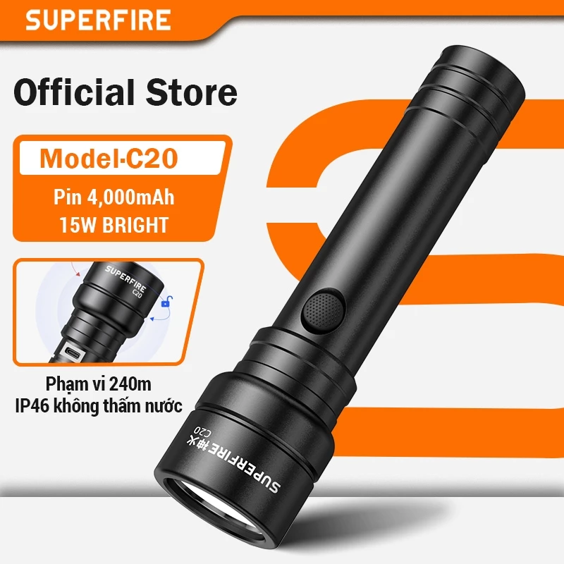 🔥 Đèn Pin SUPERFIRE C20 15W Siêu Sáng Chống Nước Sạc USB Cầm Tay Thiết Kế Tiện Lợi Dùng Ngoài Trời đang giảm giá!